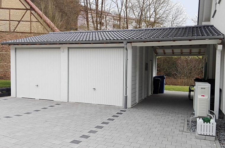 | Reihengaragen Heidelberg 10, Satteldach 15° mit Anbaucarport, auch 30° Dach möglich | |